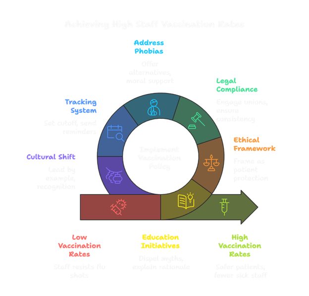 In short, mandates work. They achieve what education, free coffee gift cards, and “please get your flu shot” emails alone often could not. When it’s required, most people comply, and as we’ve established, that leads to safer hospitals. Next, we’ll discuss getting everyone on board and handling the bumps in the road that can come with implementing such a policy.