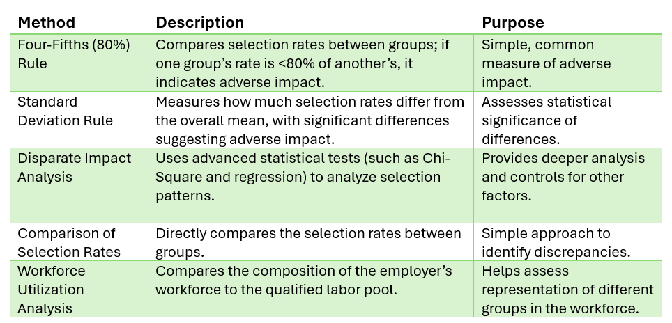 - Adverse Impact: Adverse impact is typically analyzed using statistical tools to assess whether an employment practice or policy disproportionately affects a particular group. In the U.S., the Four-Fifths Rule (80% rule) is commonly used to assess adverse impact in hiring practices. If adverse impact is found, the employer must show that the practice causing the impact is necessary for the business (a business necessity) and is not discriminatory in effect.