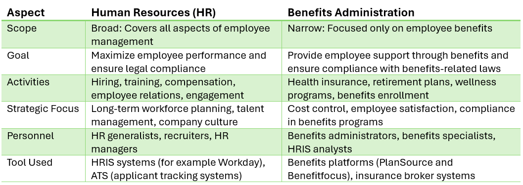 In summary, HR is the broad field that deals with everything related to managing people in an organization. Benefits administration is a focused specialization within HR that deals exclusively with managing employee benefit programs. While HR builds and enforces the people strategy, benefits administrators execute a critical part of that strategy - ensuring employees are taken care of, educated about their benefits, and protected under the law. Both roles are vital, but benefits administration requires unique skills in compliance, plan design, and employee communication, all while supporting HR’s bigger picture of building a thriving workforce. Effective collaboration between HR and benefits administration ensures that employees receive comprehensive support throughout their employment journey. This synergy is essential for fostering a positive work environment and enhancing overall organizational performance.